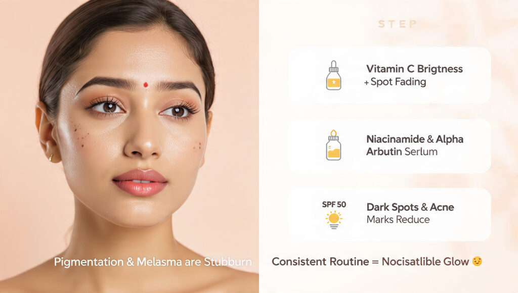 Pigmentation और melasma बहुत stubborn होते हैं, लेकिन सही routine से कुछ ही हफ्तों में noticeable फर्क दिखने लगता है। अगर आप dark spots, acne marks या uneven tone से परेशान हैं—तो ये 3-step routine आपका skin tone brighten कर देगा।
